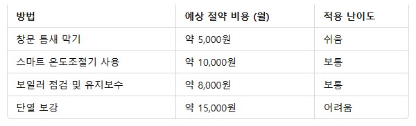 - 스마트 온도조절기 사용: 필요할 때만 난방을 가동하도록 설정하세요.